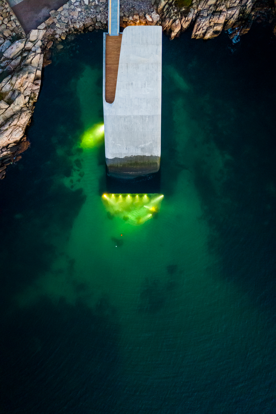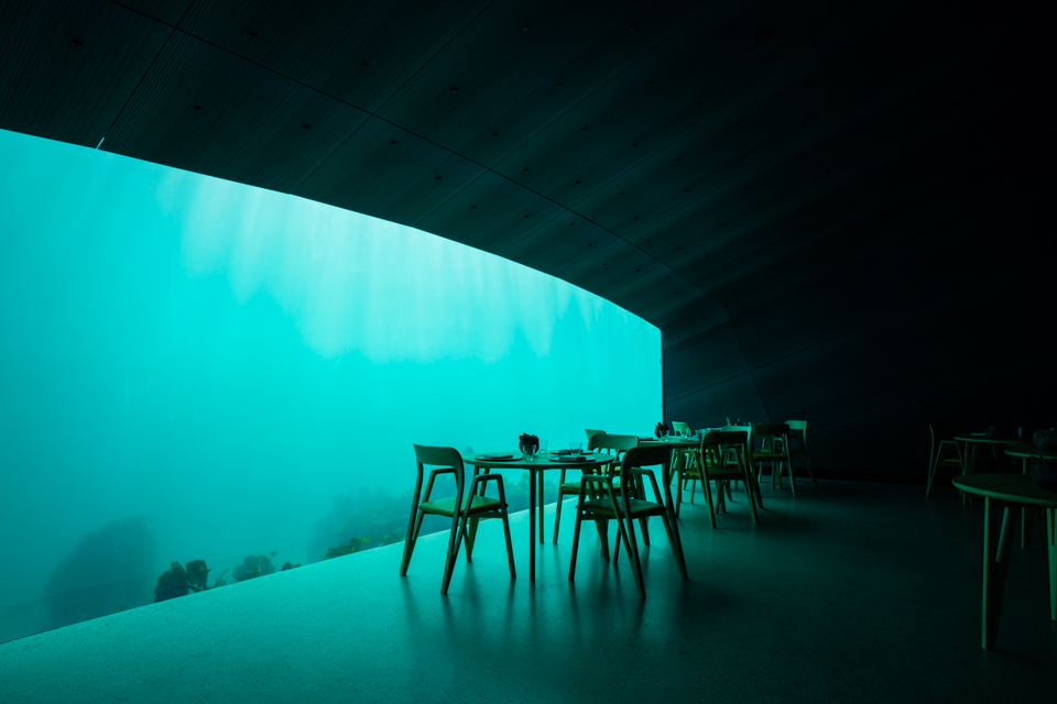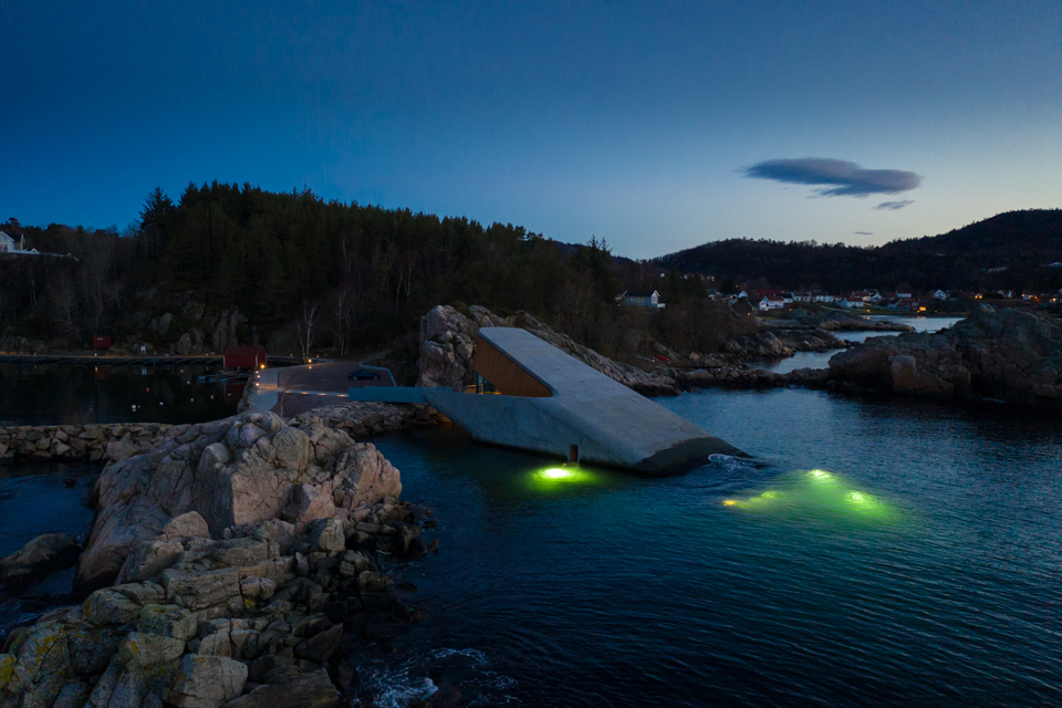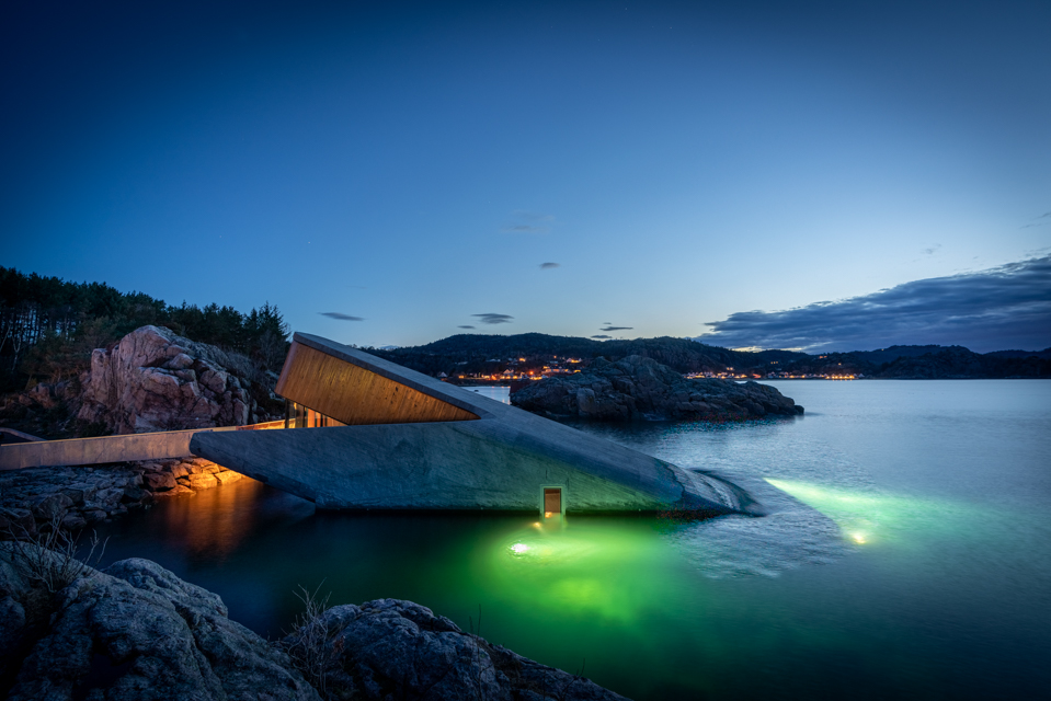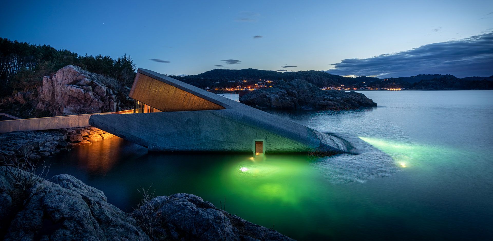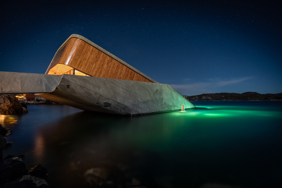 Europas erstes Unterwasser-Restaurant befindet sich im Süden von Norwegen. Welches Land wäre auch geeigneter als das Land der Fjorde und des Wassers. Und da UNDER ein UNDERwasser-Restaurant ist, darf die UNDERwasserbeleuchtung nicht fehlen. Mit hoch robusten LED-Scheinwerfern im Meerwasser wird das Architekturkunstwerk von außen beleuchtet, um dem Gast in knapp 6 Metern Tiefe eine spektakuläre Sicht auf die Unterwasserwelt zu geben. Einzigartig.