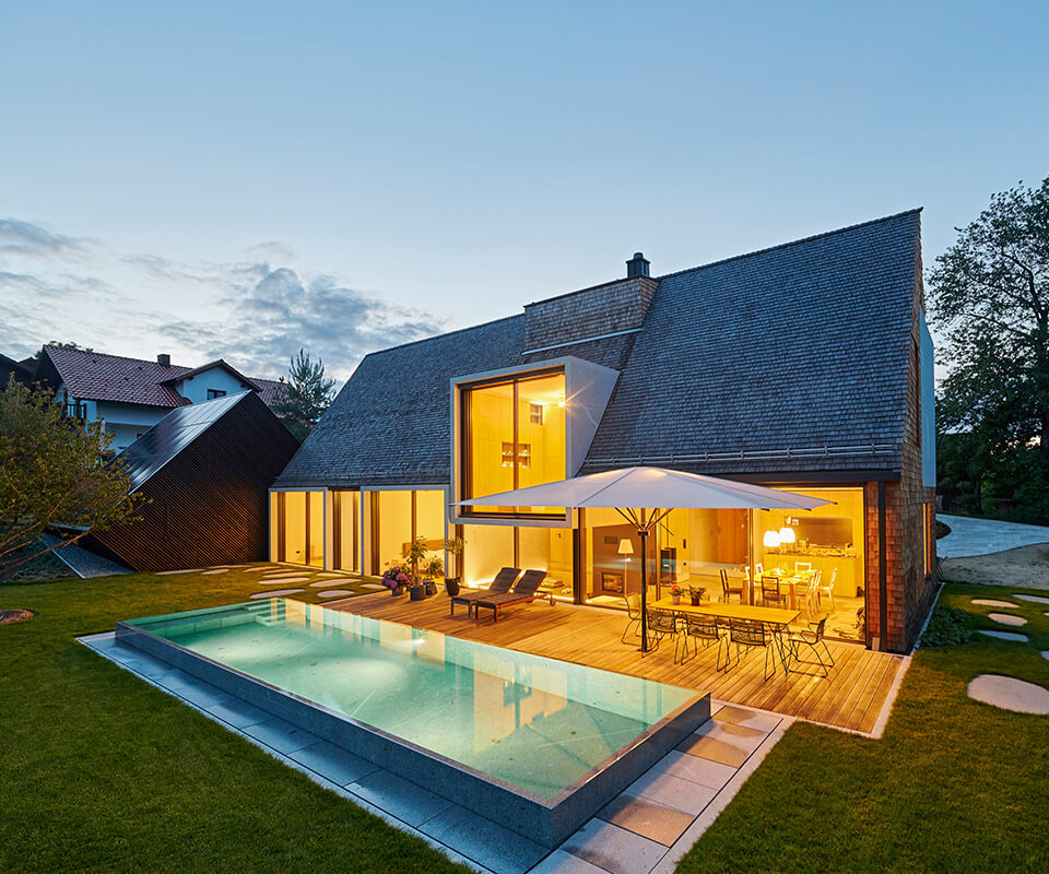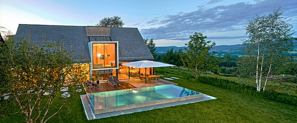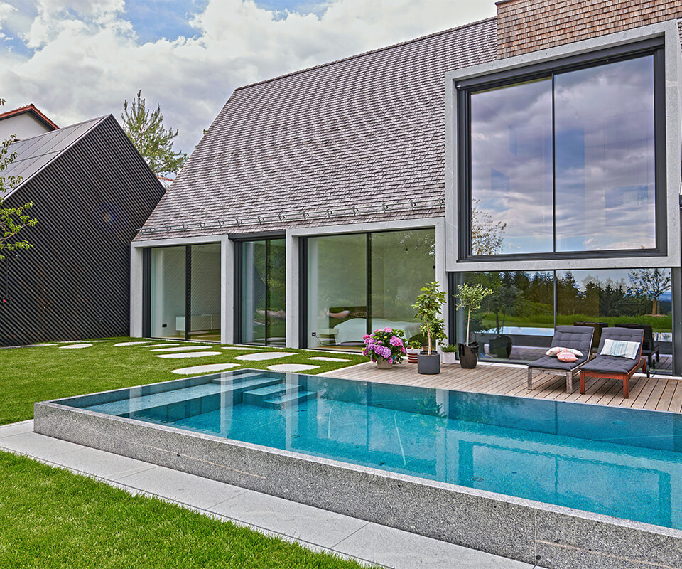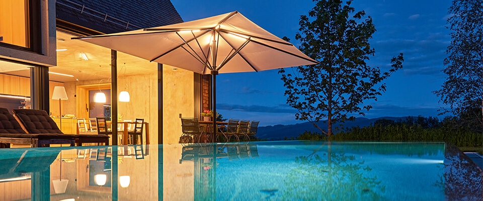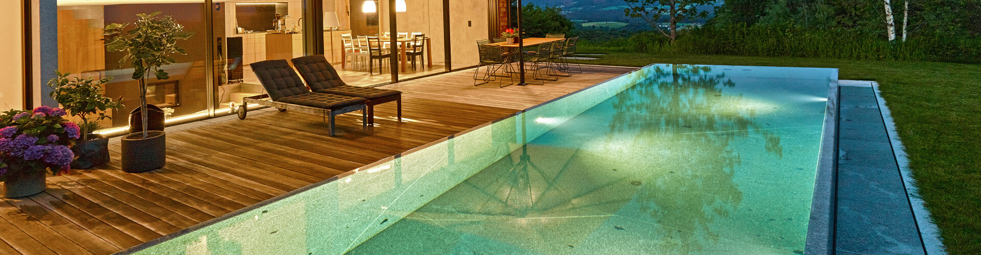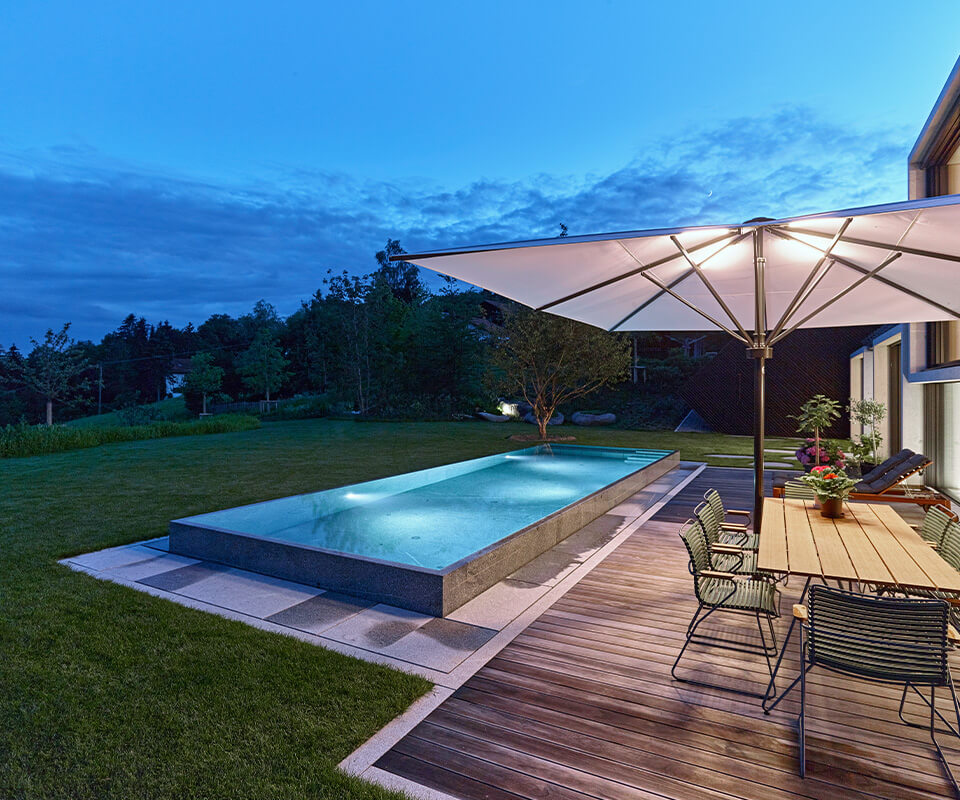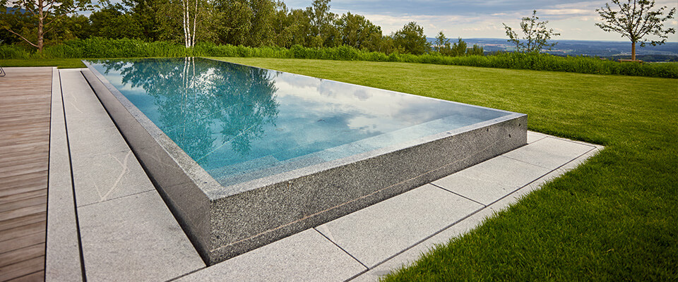 Dieses einzigartige Schwimmbecken lässt die Herzen von Poolfreunden höher schlagen. Von der Natur umgeben thront der Pool auf dem Anwesen und leuchtet majestätisch in den Abendstunden. Das Becken aus massivem Granit ist eine der edelsten Arten im Poolbau. Eleganz und Unzerstörbarkeit zeichnen dieses Material aus. Jeder Granit-Pool ist und bleibt ein Unikat. Der Naturstein unterstreicht die natürliche Farbe und Tiefe des Wassers. Die entstehende, brillante Wasserfarbe lädt zum Eintauchen ein. Mit unseren edlen Unterwasser-Scheinwerfern wird das Becken perfekt beleuchtet. Die Scheinwerfer sind nahezu bündig integriert und aus hochwertigem Edelstahl. Ein sensationelles Ergebnis.