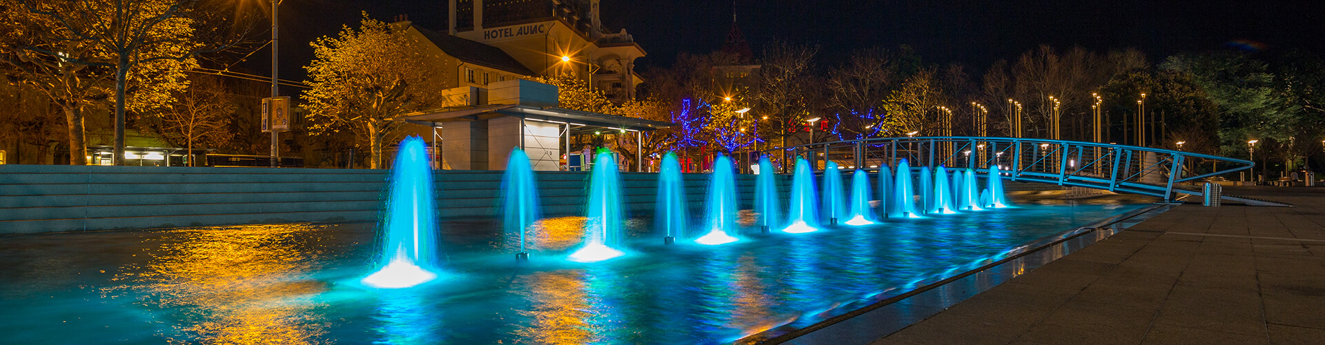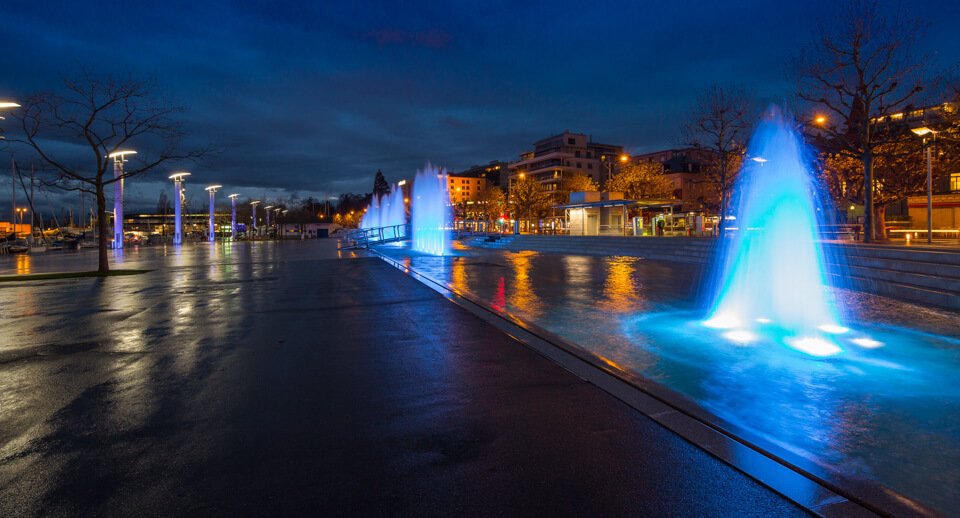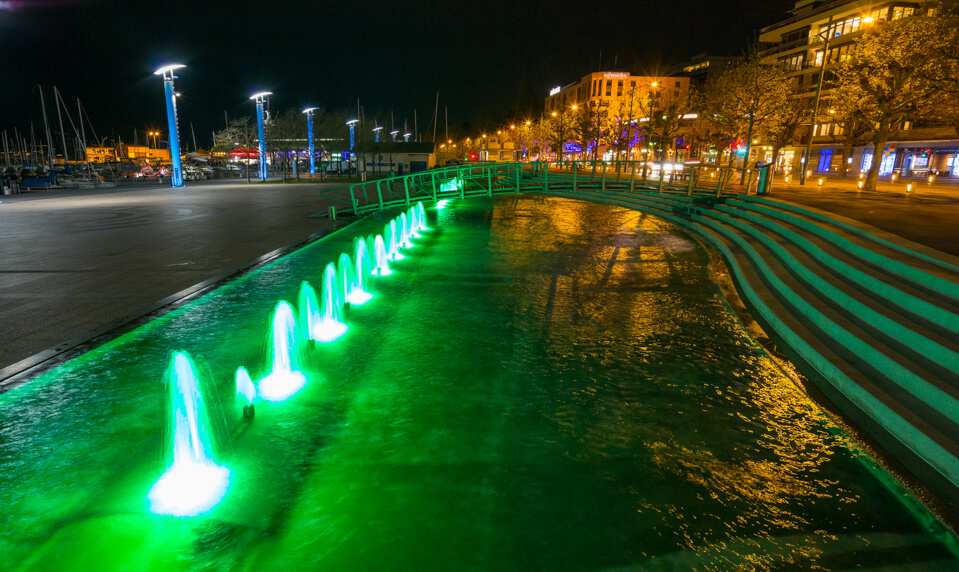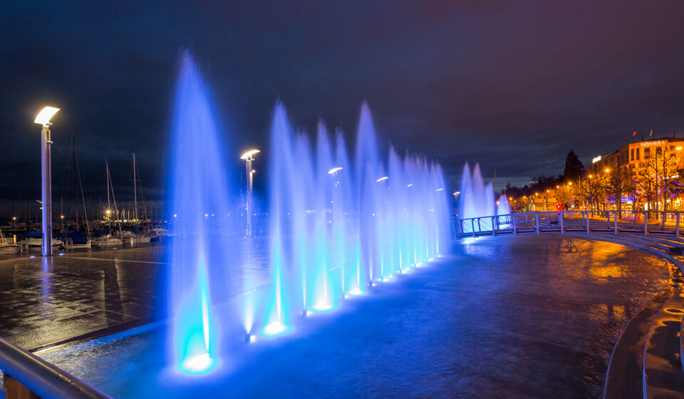 Direkt am Genfersee in der französischsprachigen Schweiz liegt die Stadt Lausanne, eine der größten Gemeinden der Schweiz. Unweit vom Olympischen Museum befindet sich am Hafen der „Place de la Navigation“ mit einer großen Springbrunnenanlage. Jede einzelne Springbrunnen-Fontäne wird mit einem Aufbau-Scheinwerfer ausgeleuchtet. Die komplette Anlage wird über eine DMX-Installation gesteuert. So ist der Platz mit dieser lebhaften Beleuchtung ein Besuchermagnet geworden.