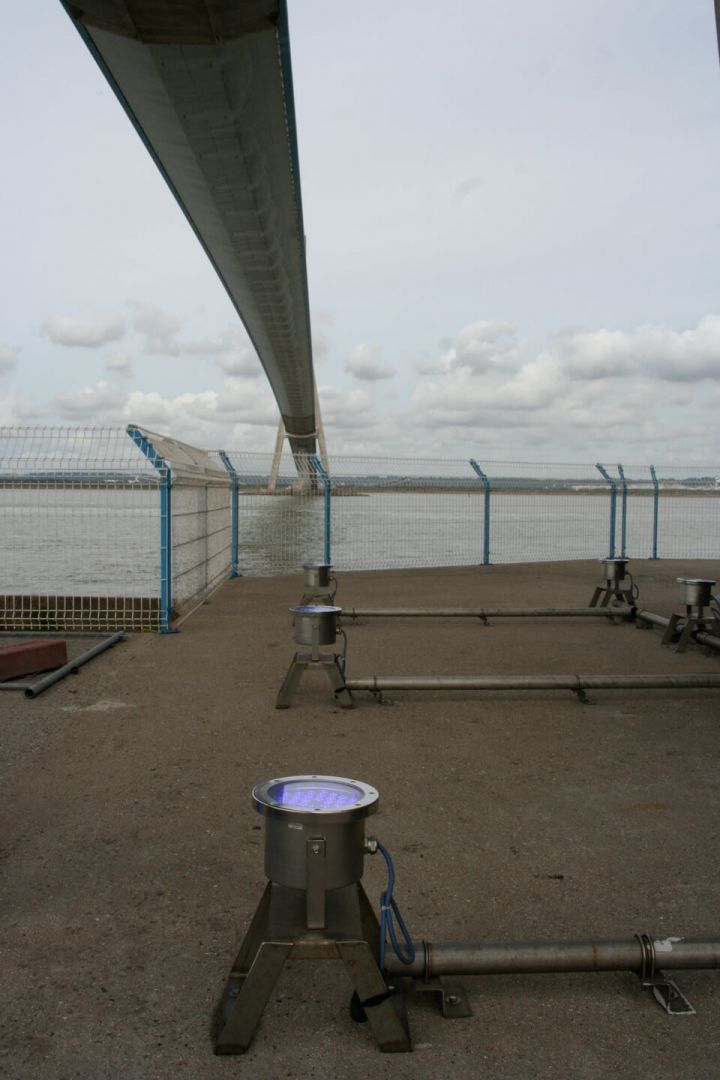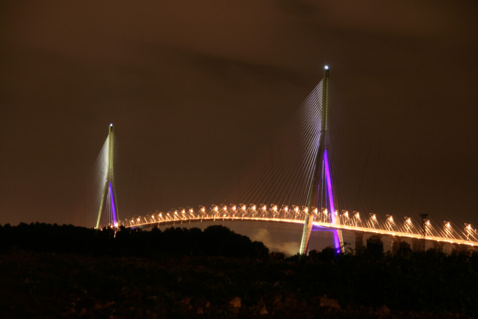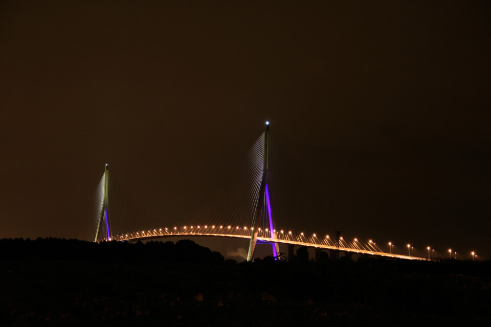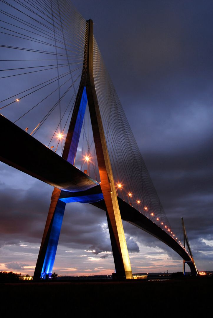 Die längste Schrägseilbrücke Europas verbindet Le Havre und Honfleur im Norden Frankreichs. Die Pylonen werden mit blauen Aufbau-Scheinwerfern angestrahlt.