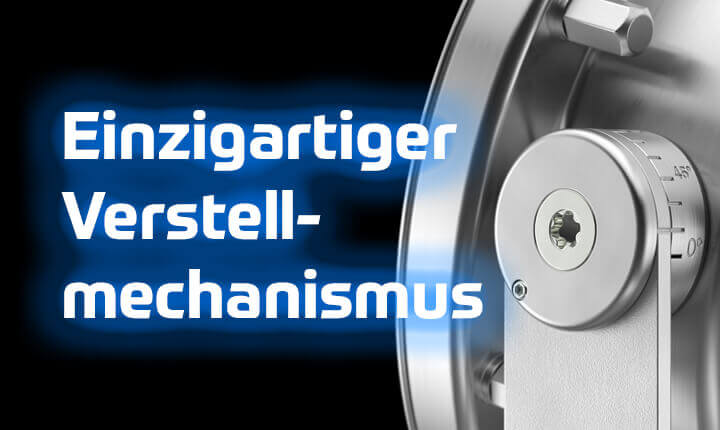 Der neuartige Verstellmechanismus aus vollem Edelstahl hält auch den größten Wassermengen stand. Neben der stufenlosen Einstellung kann der Scheinwerfer auf 0, 15, 30, 45, 60, 75 und 90 Grad gesichert justiert werden. So ist eine Loslösung der Position, zum Beispiel durch Wasserdruck, nicht möglich. Als Hilfestellung während dem Ausrichten befindet sich auf dem Gelenk eine Skala, um eine einheitliche Ausrichtung bei größeren Mengen zu gewährleisten.