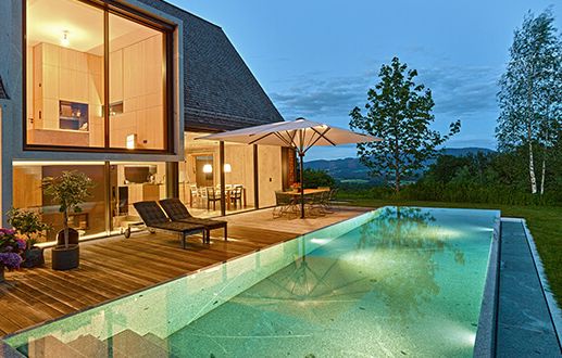 Die Art und Weise wie der Pool beleuchtet wird. Durch spezielle WIBRE-Techniken sind unterschiedlichste Gestaltungen möglich. Eine indirekte Effektbeleuchtung und Akzentuierung von Teilbereichen im Becken wird gerne umgesetzt, neben der klassischen vollflächigen Ausleuchtung des Pools. Hier kann man wiederum mit verschiedenen Winkeln arbeiten, von eng- bis breitstrahlend. Schön entspannend sind auch die Effekte, welche durch die Lichtreflexionen aus dem Wasser an der Wand und Decke entstehen.