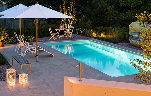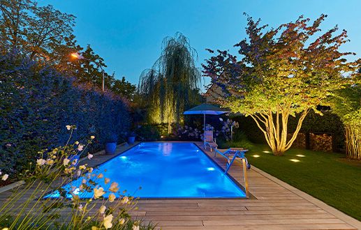 Das Gleiche gilt für die Beleuchtung außerhalb des Pools. Gönnen Sie der Terrasse und der Vegetation im Garten etwas Licht, um abendliche Akzente zu setzen. Die stimmungsvolle Beleuchtung schafft ein wohltuendes Gesamtbild und lädt zum Verweilen ein. Mit kleinen Spots um den Pool herum, Strahlern unter den Bäumen und ein paar Laternen auf der Terrasse. So können Sie Ihre Oase voll und ganz genießen.