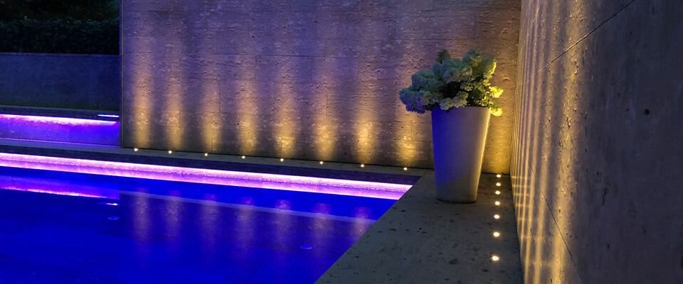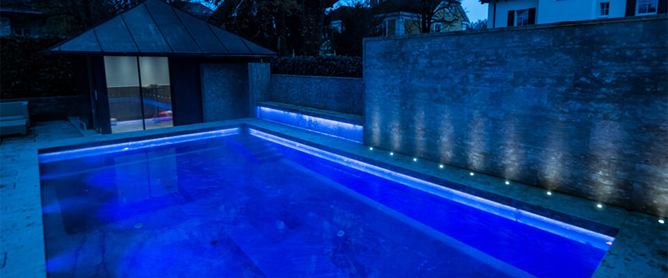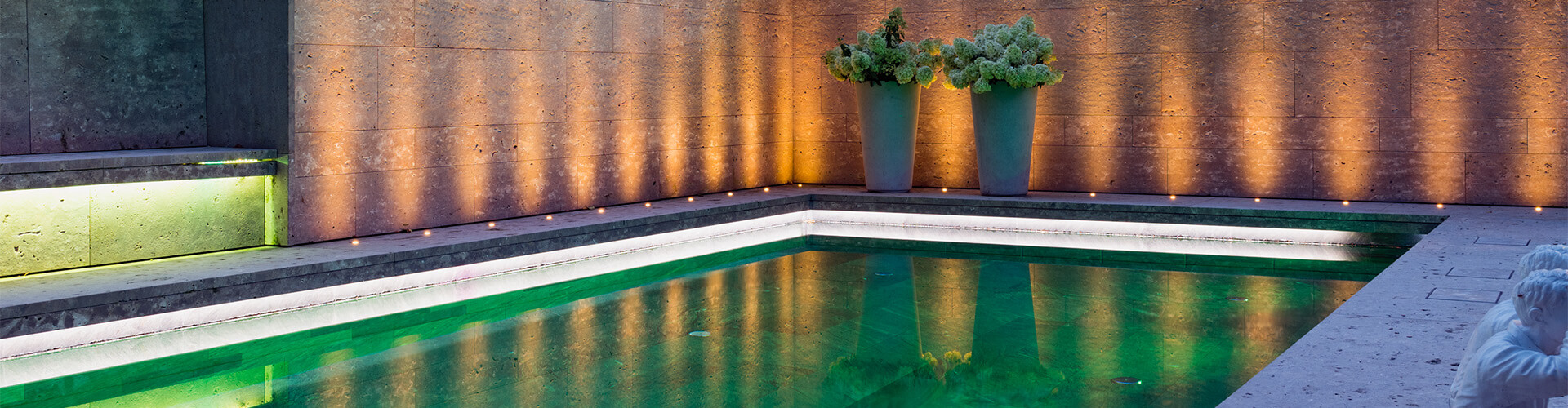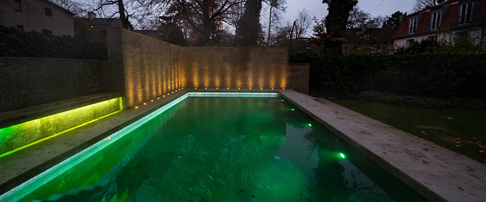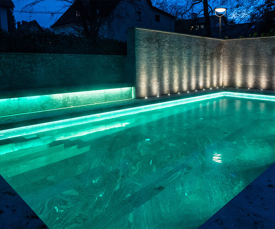 Dieses großzügige Becken mit einer Größe von 9 x 4,50 Meter wird mit fünf WIBRE RGBW- Scheinwerfern perfekt in Szene gesetzt. Besonders in den Abendstunden sorgt das mediterrane Ambiente für Entspannung und Ruhe. Ein wahrer Urlaubstraum im eigenen Garten.