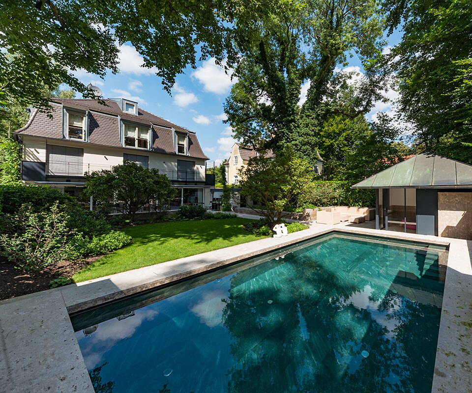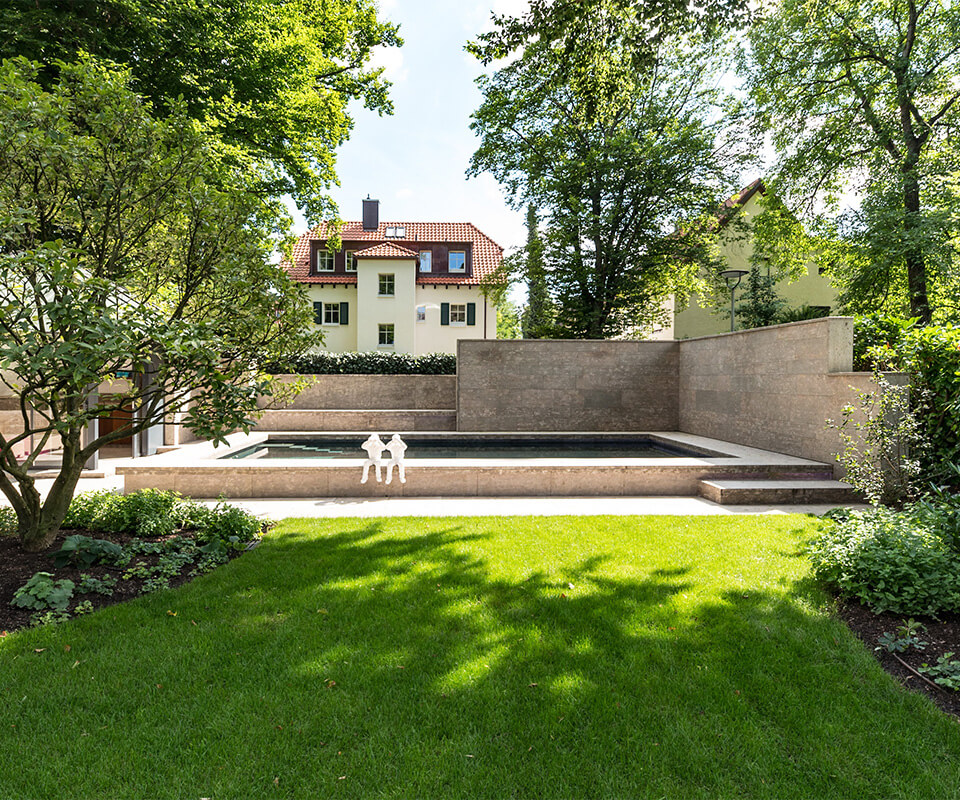 Das Stahlbetonbecken ist mit dem Naturstein „Dorfergrün“ ausgekleidet. Der olivgrüngelbe, farbechte Chloritschiefer stammt aus Osttirol und wird neben vielfältigen Einsatzmöglichkeiten in der Gebäude-Architektur auch für Schwimmbecken eingesetzt.