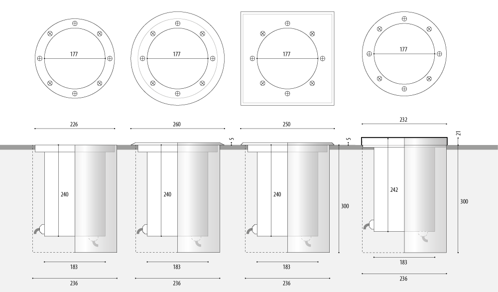 - mit planebene Blende, runde oder quadratische Aufsatzblende oder Winkelringblende
