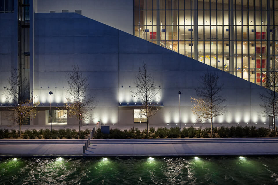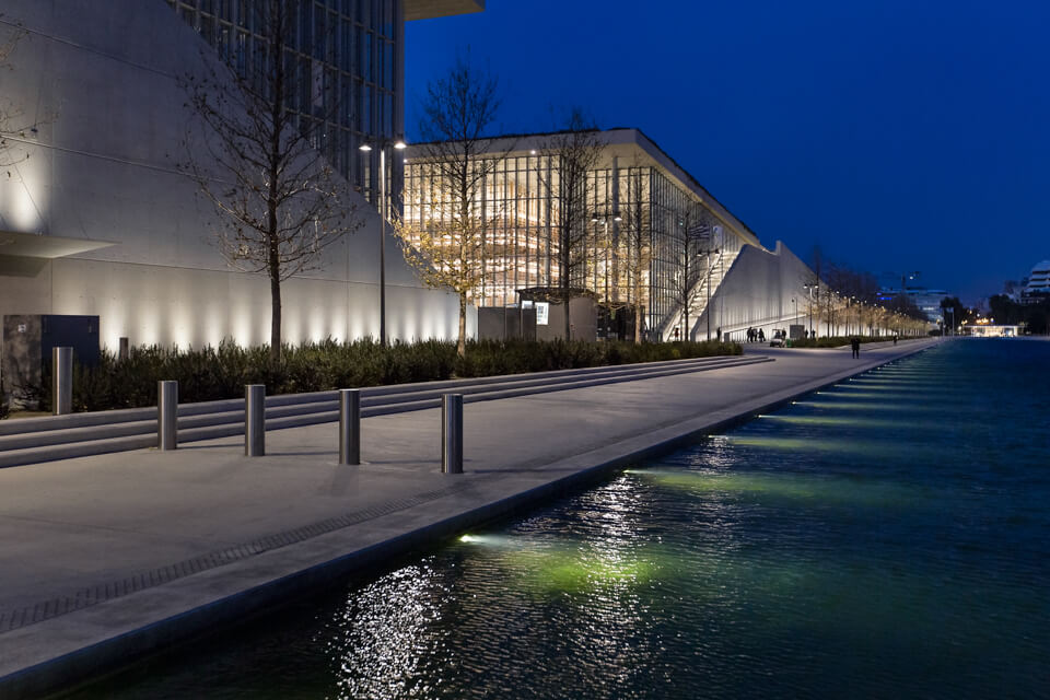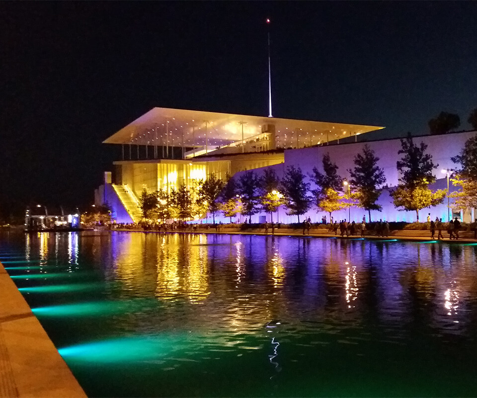 Das 2016 fertiggestellte Kulturzentrum beinhaltet die nationale griechische Oper und die nationale Bibliothek Griechenlands. Umschlossen wird das Gebäude von einer wunderschön angelegten Parkanlage mit Alleen, Springbrunnen, Spielplätzen und einem spektakulären Wasserkanal. Mit speziell entwickelten RGB-W-Bodeneinbauleuchten und RGB-W-Unterwasserscheinwerfern wurde eine flexible, robuste und langlebige Ausleuchtung geschaffen.