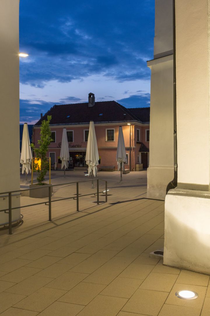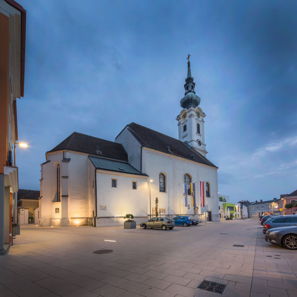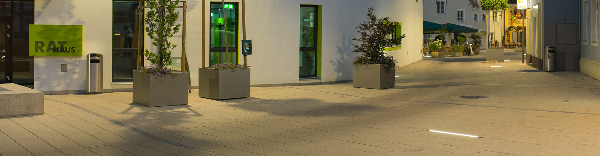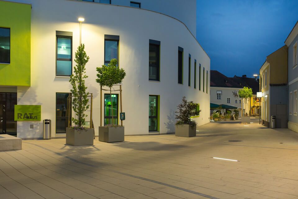 Im Zuge eines umfassenden Stadtplatzerneuerungsprojektes wurde die Modernisierung des Platzes umgesetzt. Neben den baulichen Maßnahmen war die moderne Gestaltung des Platzes mit linearen Lichtelementen in LED eine wesentliche Forderung des Architektenteams. Demnach ist ein tragendes Designelement die Linienleuchte 4.1010. Wesentliches Entscheidungskriterium war die Ausführung der Leuchte mit IP67 Stecksystem, welches eine Durchgangsverdrahtung ermöglicht, da die Elemente in unregelmäßigen Abständen am Platz verteilt sind. Mit den mitgelieferten Einbaugehäusen war eine einfache Montage möglich. Zur Anstrahlung der Stadtkirche wurde hier auf den bewährten Einbauscheinwerfer 4.0098 mit 70 Watt HIT gesetzt.