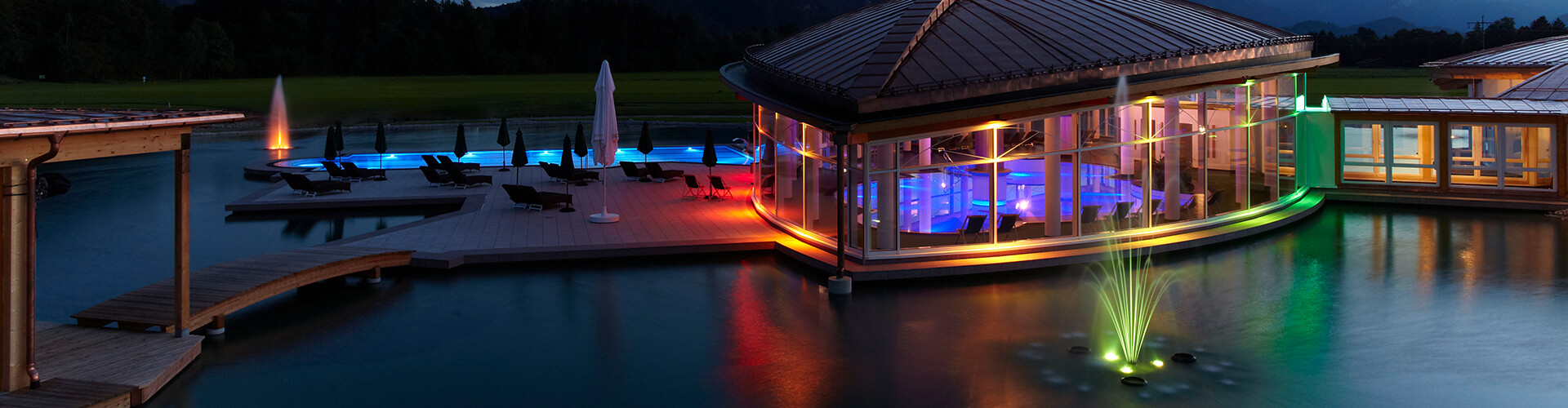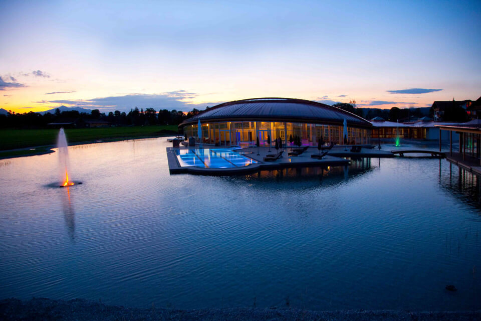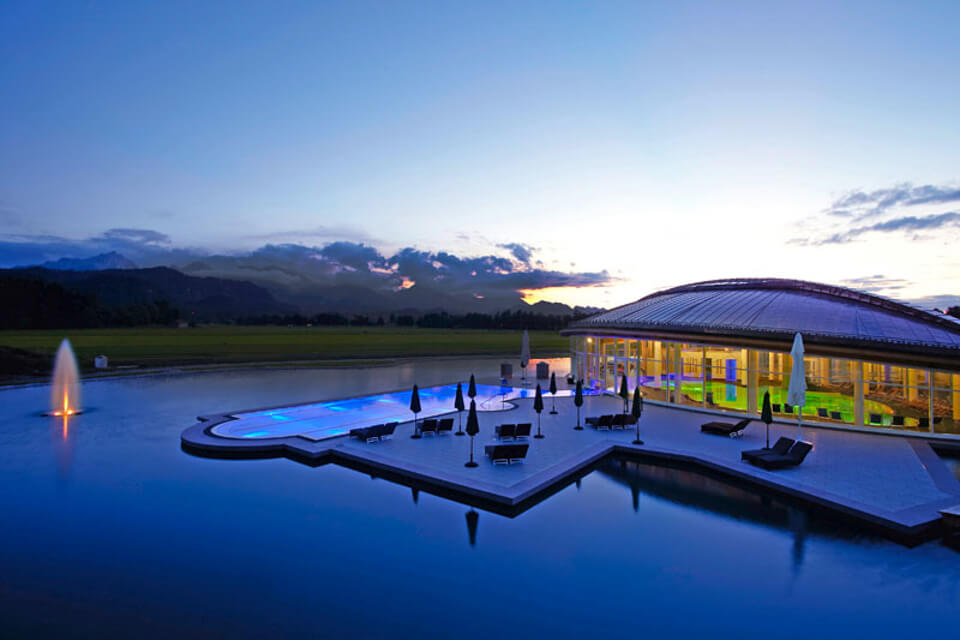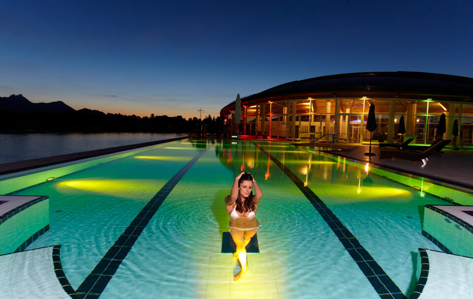 The Hotel König Ludwig stands out in the middle of the Schwansee and enchants its guests with various wellness and leisure facilities. Here the guest is brought to completely new levels of relaxation by the various applications and the atmospheric light used for this purpose.