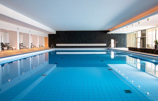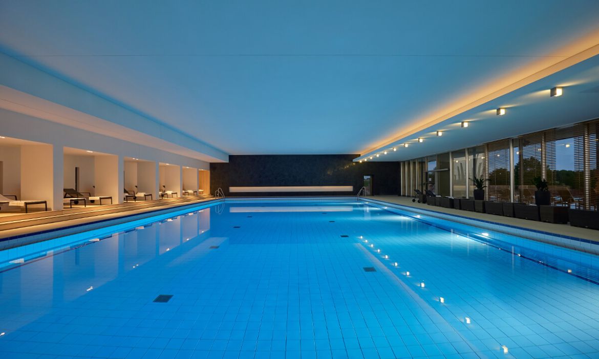 In contrast to the Asia Spa, the large indoor pool is harmoniously and evenly lit. Several large spotlights, designed for sports pools, illuminate the entire pool in a neutral white light. The lossless LED lighting technology and a unique cooling process create a powerful lumen package and allow for safe illumination of such large pools. After a successful round of golf or an intense meeting, guests can take one lane at a time and let off steam. The light distribution, specially adapted for swimming pools and achieved through specially arranged lenses, also guarantees glare-free lighting while swimming.