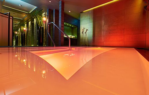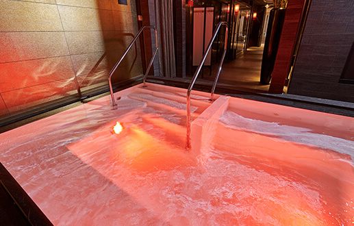 A few red lantern shades as decorative highlights lead guests to the onsen pool, appropriately bathed in red, within the dramatically lit Asia spa. Two powerful yet compact spotlights create red light in the water, emphasizing the high water temperature.