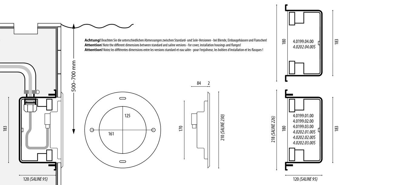 - Note the different dimensions between standard and saline versions - for cover, installation housings and flanges!