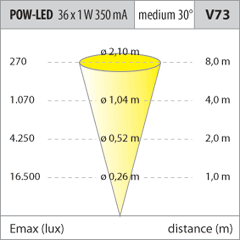 | 4.0365.00.02 | 36 POW-LED | 4860 lm | 3000K warm white | total 43 W | Klemme | 30° medium | UW, 6x1,0 + 2x0,5 qmm | ||