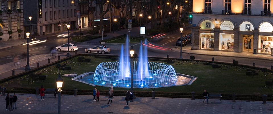 "Le Jardin de la France", comme on appelle aussi la ville de Tours, est situé sur la Loire, entre Orléans et la côte atlantique. La ville, chargée d'histoire, avec ses innombrables ponts, ses magnifiques palais urbains et ses cathédrales anciennes, est faite pour l'éclairage extérieur urbain. Outre de nombreux jardins, boulevards et terrasses, le majestueux hôtel de ville trône au cœur de la cité devant la "Place Jean Jaurès", place centrale et pôle d'attraction des visiteurs avec deux fontaines pompeuses comme points de repère. Dans le cadre de la rénovation de plusieurs places publiques, les fontaines ont été redessinées, restaurées et remises en lumière grâce à un concept d'éclairage bien pensé. Les anciens luminaires PAR38 de 120 watts, qui nécessitaient beaucoup d'entretien, ont été remplacés par des luminaires LED POW en acier inoxydable de longue durée. Cela permet d'économiser jusqu'à 70 % des besoins en électricité, de réduire l'entretien au minimum et d'augmenter l'attrait de l'ensemble de la place. Dans l'anneau extérieur de la fontaine sont également installés 18 luminaires directement derrière les buses. À l'intérieur, 4 projecteurs éclairent l'eau qui tombe ou les fontaines individuelles. Les couleurs sont portées de manière optimale par l'eau qui coule, de sorte que l'ensemble du jet d'eau brille. L'ensemble de l'installation d'éclairage est intégré dans le système DMX existant afin de commander les fontaines de manière synchrone et de les illuminer comme souhaité. Le "Jardin de la France" est désormais enrichi de deux attractions aquatiques illuminées, et Tours fait à nouveau honneur à ce nom.