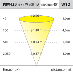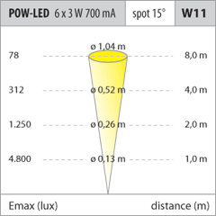 - POW-LED avec angle de diffusion spot 10°, medium 30°, wide 45°, flood 90° et elliptique 15x40°