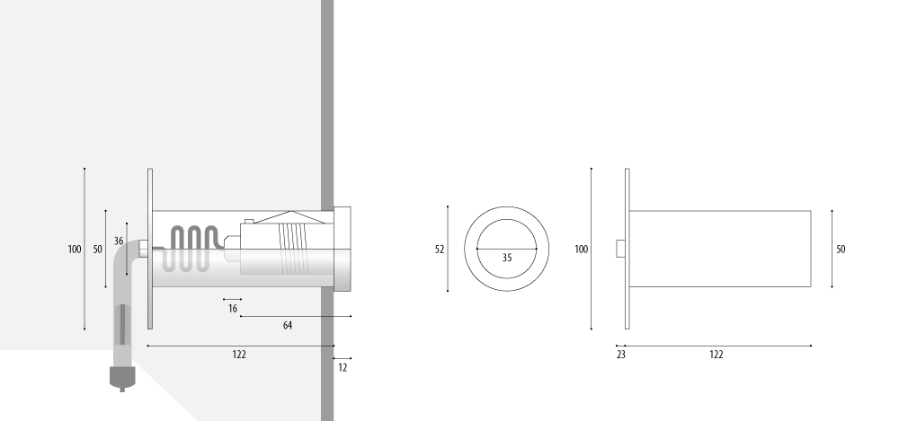 - Boîtier d’encastrement en INOX 316L avec 1,5 m de gaine de protection pour câble, embout de serrage avec presse-étoupe (M20 plastique)