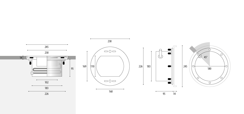 - en connexion avec bague de nivelage en ABS pour un montage ras de sol dans les bassins en béton avec revêtement en carrelages (standard 14 mm)